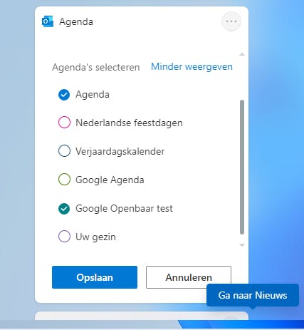 Wil je meerdere agenda’s toevoegen aan de Agenda-widget? Klik dan op de drie puntjes rechts bovenaan de widget en kies voor Widget aanpassen. Vervolgens verschijnt er een lijst met extra agenda’s. Die lijst komt overeen met de agenda’s die je in je mailaccount van Outlook.com hebt staan. Selecteer de agenda’s die je wilt opnemen in het overzicht door het rondje voor de naam aan te klikken.