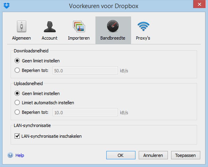 Het synchroniseren van de inhoud van je Dropbox-map gaat volledig automatisch. Je vindt Dropbox als icoontje in je systeemvak, rechtsonder in beeld. Klik op het icoontje, klik vervolgens op het tandwiel-icoontje en kies Voorkeuren. Verwijder het vinkje bij Meldingen op desktop weergeven als je vindt dat het programma te vaak pop-ups toont. Interessanter is de optie Bandbreedte. Kies hier voor de optie Geen limiet als je een snelle internetverbinding hebt en wilt dat je Dropbox altijd zo snel mogelijk wordt bijgewerkt.