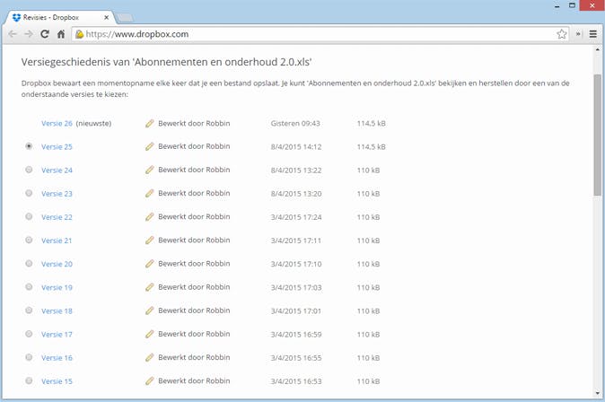 Een van de voordelen van Dropbox ten opzichte van de concurrentie is bestandsherstel. Van alle bestanden die je bewaart in je Dropbox, worden namelijk meerdere versies bijgehouden. Als je dus een Word-bestand opent vanuit je Dropbox en het document vervolgens verprutst en bewaart, kun je een eerdere versie terug laten zetten. Dit is handig als je langer werkt aan bijvoorbeeld een project, werkstuk of scriptie. Zorg ervoor dat je het bestand voor je ziet in de Windows Verkenner. Gebruik de rechtermuisknop en kies Vorige versies weergeven. De webomgeving van Dropbox verschijnt in beeld waarna je met één muisklik een eerdere versie terugzet (of downloadt). Oudere versies worden standaard dertig dagen bewaard. Voor Dropbox Pro is een uitbreiding beschikbaar om revisies tot een jaar oud terug te halen.