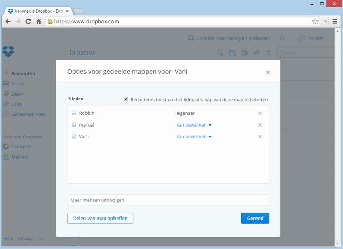 Het beheren van de mappen die je gedeeld hebt werkt via www.dropbox.com. Klik achter de gedeelde map op Delen / Mensen uitnodigen om samen te werken.