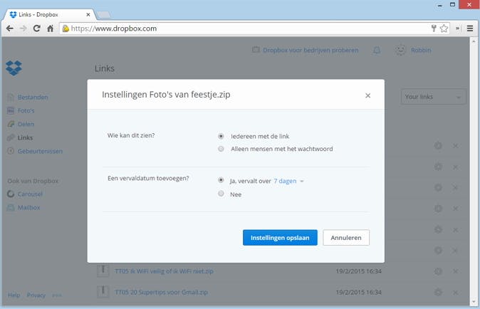 Om te zien welke links je in het verleden hebt aangemaakt, meld je je aan bij www.dropbox.com en kijk je bij Links. Achter een bestand of map vind je een kruisje om de gedeelde link op te heffen. Je bestand(en) downloaden is dan niet meer mogelijk. Klik op het tandwiel-icoontje voor geavanceerde opties. Je kunt bijvoorbeeld een wachtwoord instellen en een vervaldatum bepalen waarna de downloadmogelijkheid automatisch wordt opgeheven.