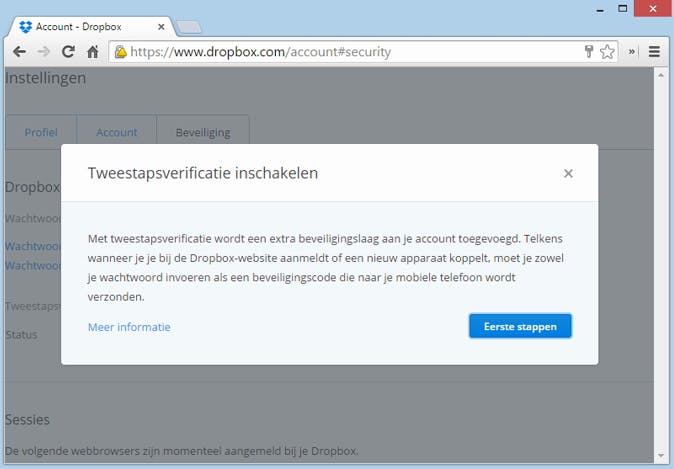 Activeer 'tweestapsverificatie' om Dropbox beter te beveiligen tegen onbevoegden.