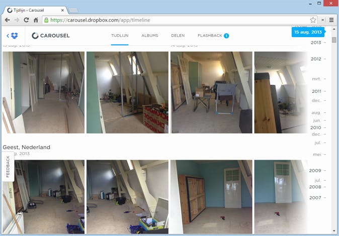 Dropbox heeft een eigen foto-app waarmee je op een prettige manier door al je foto's in je Dropbox bladert. De optie voor Carousel vind je na het aanmelden op www.dropbox.com in de linkerkolom. Installeer ook de Carousel-app op je iOS- en/of Android-toestel. Een goede tijdlijn en albums staan centraal. Helaas indexeert Carousel standaard alle foto's in je Dropbox en dus ook veel rommel. De optie om mappen uit te sluiten lijkt aanwezig, maar het zou prettig zijn als dit andersom werkt: de gebruiker laten kiezen welke mappen er in Carousel mogen verschijnen en de rest negeren.