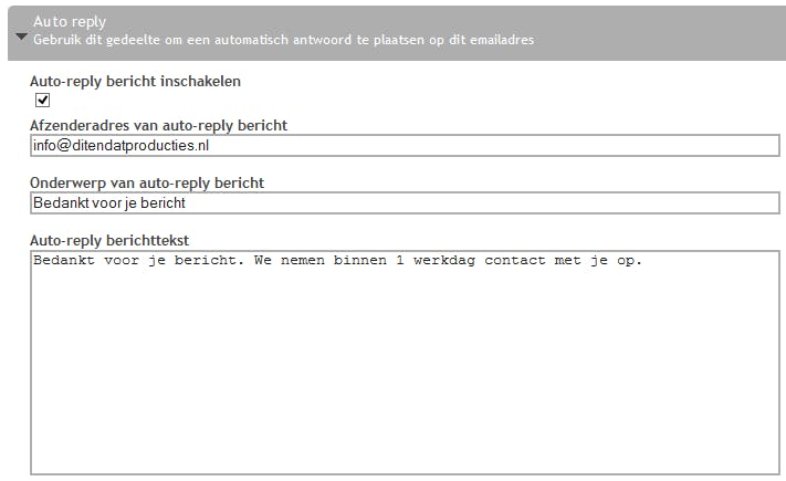 Bij de meeste bedrijven, verenigingen of andere organisaties is het mogelijk om direct contact op te nemen via een contactformulier op de site of door een mailtje te sturen naar het info@-adres. Zeker bij een eerste contact is het belangrijk dat je snel reageert. Bij sommige hostingaanbieders zoals Mijndomein is het mogelijk om in de e-mail instellingen van je hosting account een zogeheten ‘auto reply’ in te stellen. Hiermee ontvangt iedereen die contact opneemt direct automatisch een bevestigingsmailtje. Schakel auto-reply ook in voor ‘normale’ e-mailadressen wanneer je door feestdagen of vakantie niet in staat bent om direct je e-mail te beantwoorden.