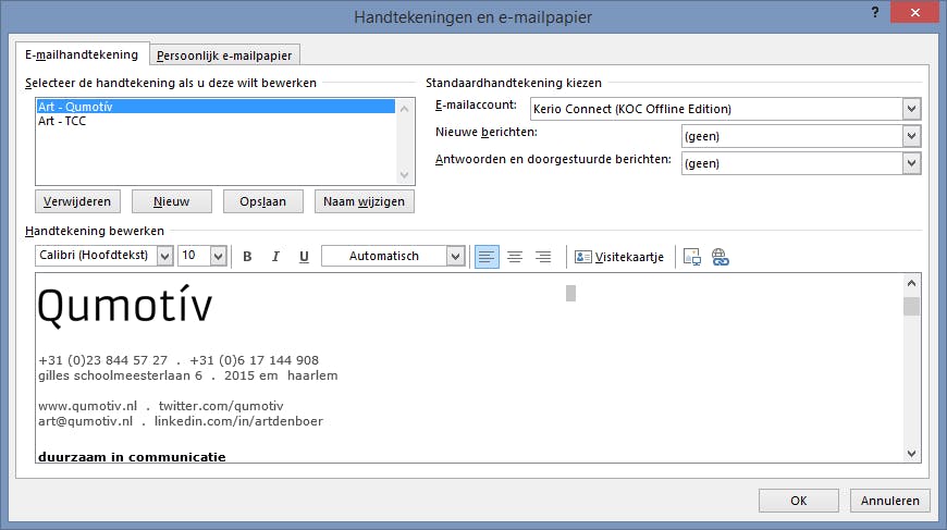 Wat nog heel vaak voor komt is dat mensen e-mail versturen zonder handtekening of - erger - bij mobiele apparaten de standaard handtekening niet veranderen. In dat laatste geval staat er onder zo’n mailtje een bericht als ‘Verzonden vanaf mijn Samsung Galaxy’. Gebruik je een e-mailprogramma als Outlook of Mail, dan is het mogelijk om ieder uitgaand bericht van een fraaie handtekening te voorzien. Er zijn online handleidingen te vinden voor Windows Live Mail, Outlook en Apple Mail. Wil je een afbeelding aan de handtekening toevoegen, upload deze dan eerst naar je eigen hostingaccount en link naar dit plaatje in je handtekening. Alleen zo zorg je ervoor dat anderen deze daadwerkelijk kunnen zien.