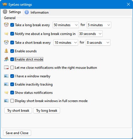 Om jezelf te verplichten de nodige (kijk)pauzes in te lassen, kun je ook een tool als EyeLeo inzetten. De link kan een waarschuwing tonen: geen zorgen, de site is veilig. Je configureert deze app vanuit het Windows-systeemvak, via EyeLeo Settings. Je geeft hier aan hoe frequent en hoelang je pauzes wilt en via Enable Strict mode zorg je ervoor dat je deze niet (zomaar) kunt uitstellen. Je krijgt tijdens deze pauzes bovendien geanimeerde (oog)oefeningen.