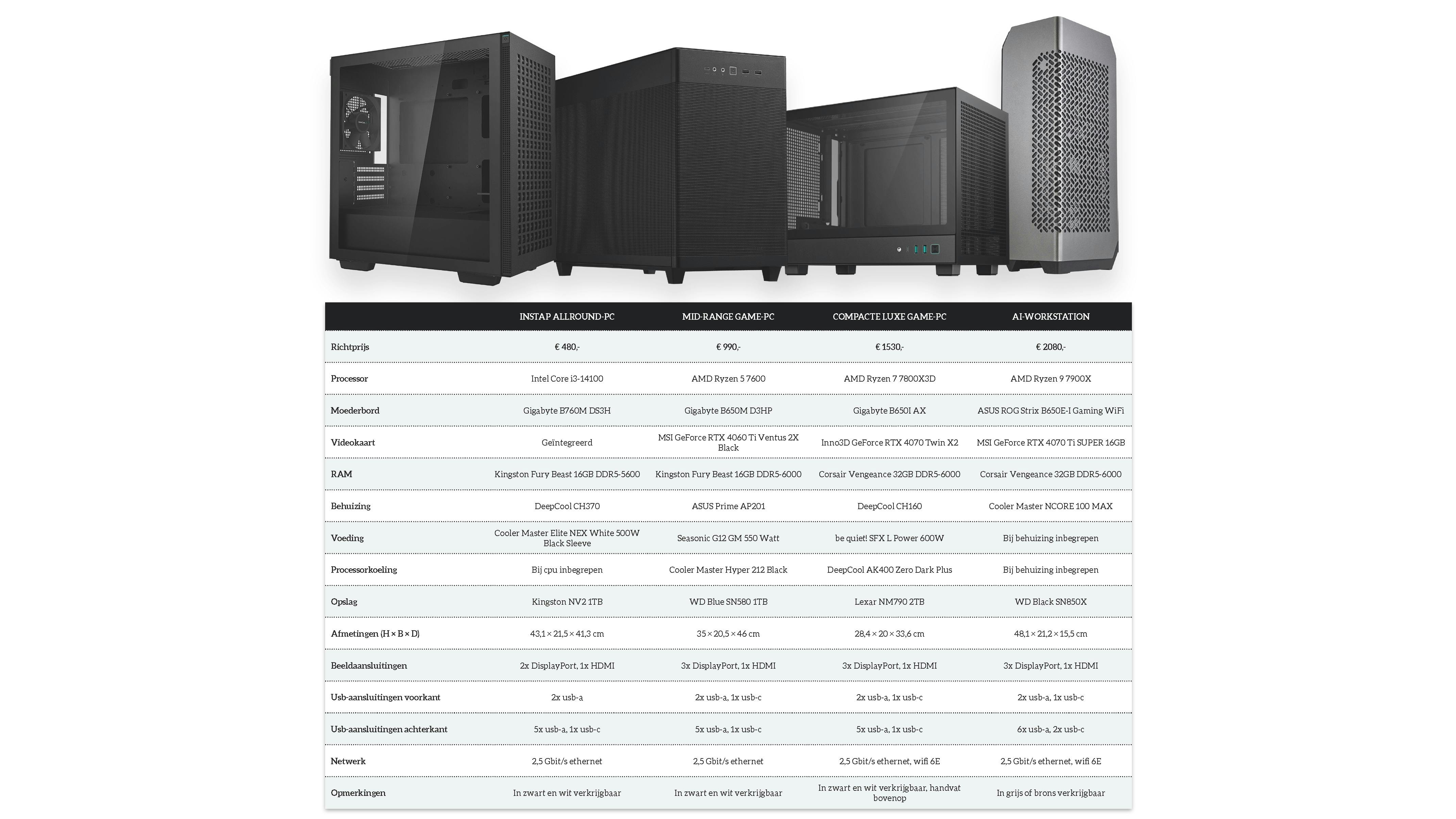 We hebben voor deze koopgids vier primaire doelen gesteld: een allround-pc voor circa 500 euro, een game-pc van ongeveer 1000 euro, een ultra compacte game-pc voor 1500 euro en om mooi op de hype van 2024 aan te haken: een AI-workstation dat afhankelijk van de videokaart ergens tussen de 1700 en 3000 euro uit zal komen. Voor elk systeem bespreken we wat de doelen zijn, wat je ervan mag verwachten en waar eventueel nog wat aanpassingsmogelijkheden liggen.