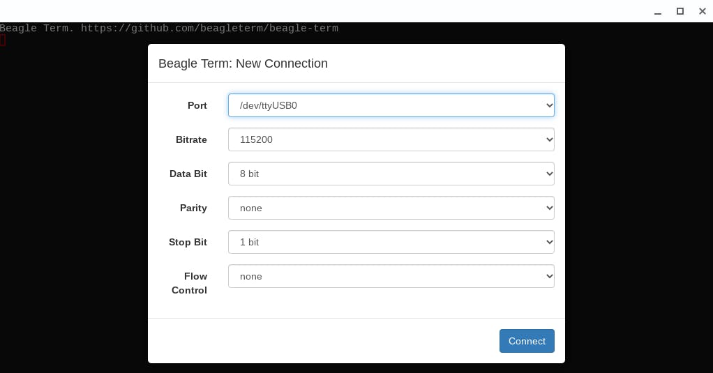 Voor de rest maakt het niet uit welk terminalprogramma op welk systeem je gebruikt. Prik de aan de Z80-MBC2 verbonden USB-naar-TTL serieel converter in een vrije USB-poort van je computer. Start het terminalprogramma. Zorg dat je als bitrate een waarde van 115200 kiest (meestal dien je bij de eerste verbinding met het een of ander een profiel aan te maken, of je duikt even in de settings van het terminal-programma). Het aantal data bits dient op 8 ingesteld te zijn, het Stop Bit is 1 bit, Flow Control none. Afhankelijk van de gebruikte USB-converter kies je de correcte seriële poort, in ons voorbeeld op de Chromebook /dev/ttyUSB0. Maar dat kan zomaar iets anders zijn op jouw systeem!