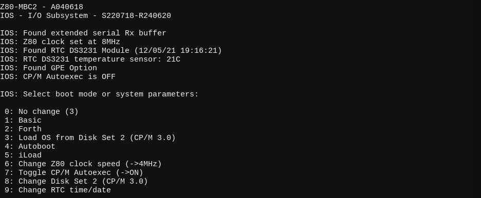 Klik in het terminalprogramma op de knop Connect of iets soortgelijks en je ziet als het allemaal een beetje meezit dat wat je Z80-MBC2 te melden heeft. Vanaf nu moet je het terminalvenster simpelweg als het beeldscherm van de Z80-MBC2 beschouwen. Tegelijkertijd lichten de verschillende LED’s op het systeembord op, en knippert er wat als er seriële data wordt uitgewisseld.