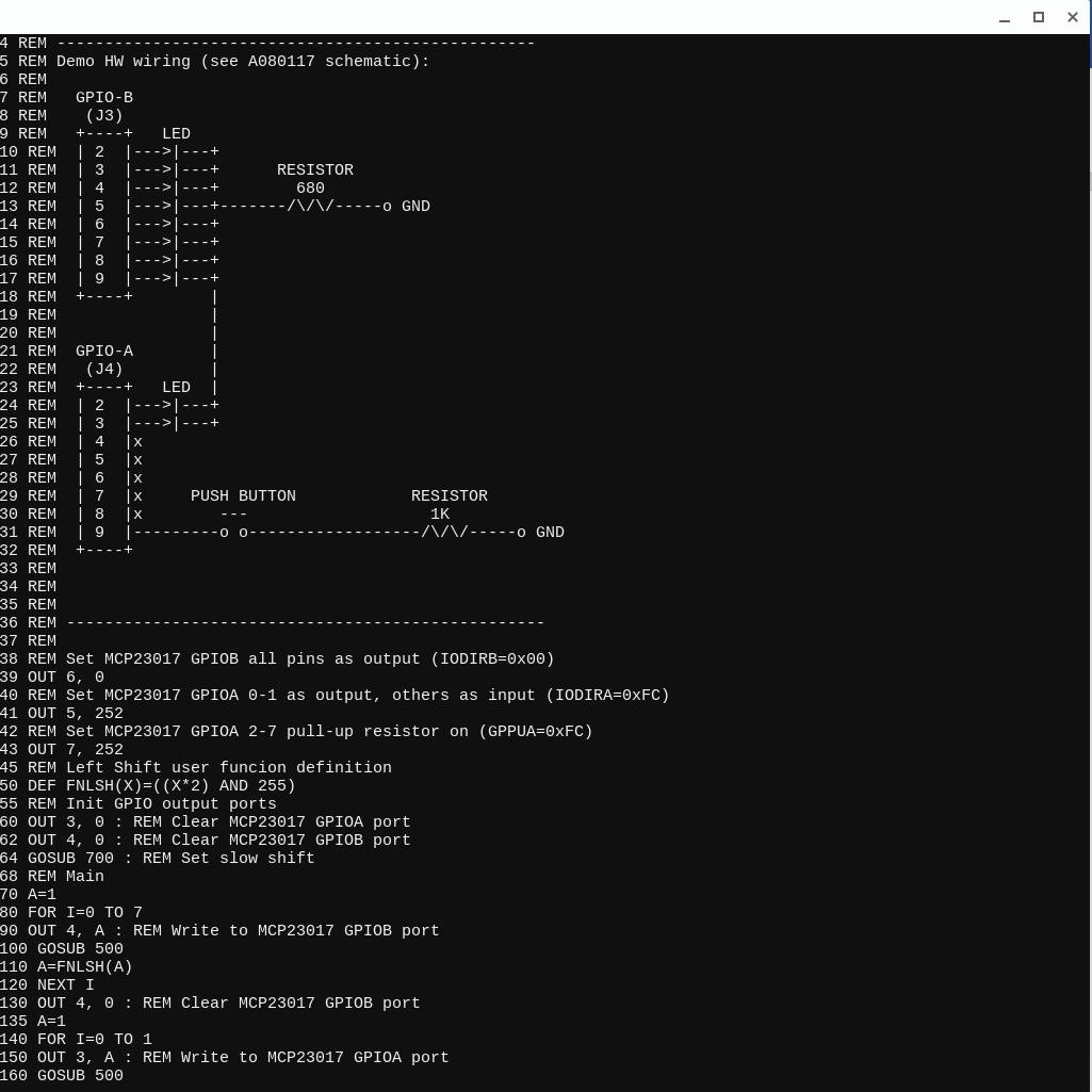 Het CPM-systeem beschikt over een USER-LED, die kun je vanuit Basic aansturen. Hoe, dat kun je zien in het programma USERLED.BAS. Om het programma te verlaten druk je op de ook aanwezige USER-knop op ’t bord. Heb je een GPIO-chip op je Z80-MBC2 geprikt, dan kun je ook allerlei andere zaken via de GPIO-poort regelen. En ook nu is er weer een voorbeeldprogramma beschikbaar, het heet GPIO.BAS. Precies die GPIO-poort maakt dit systeem ook uitermate interessant voor het besturen van allerlei dingen; de programmeertaal Basic is in z’n jaren tachtig-vorm wel heel makkelijk te leren!