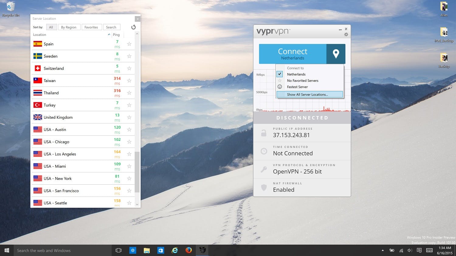 VyprVPN-gebruiken op je desktop is makkelijk. Je hoeft daar alleen maar de applicatie voor te downloaden via de website. Na het installeren log je in met je gebruikersnaam en wachtwoord, en hoef je alleen maar op 'Connect' te klikken. Via het blauwe balkje kun je bovendien kiezen uit verschillende servers, zodat je op een Amerikaans IP-adres zit.