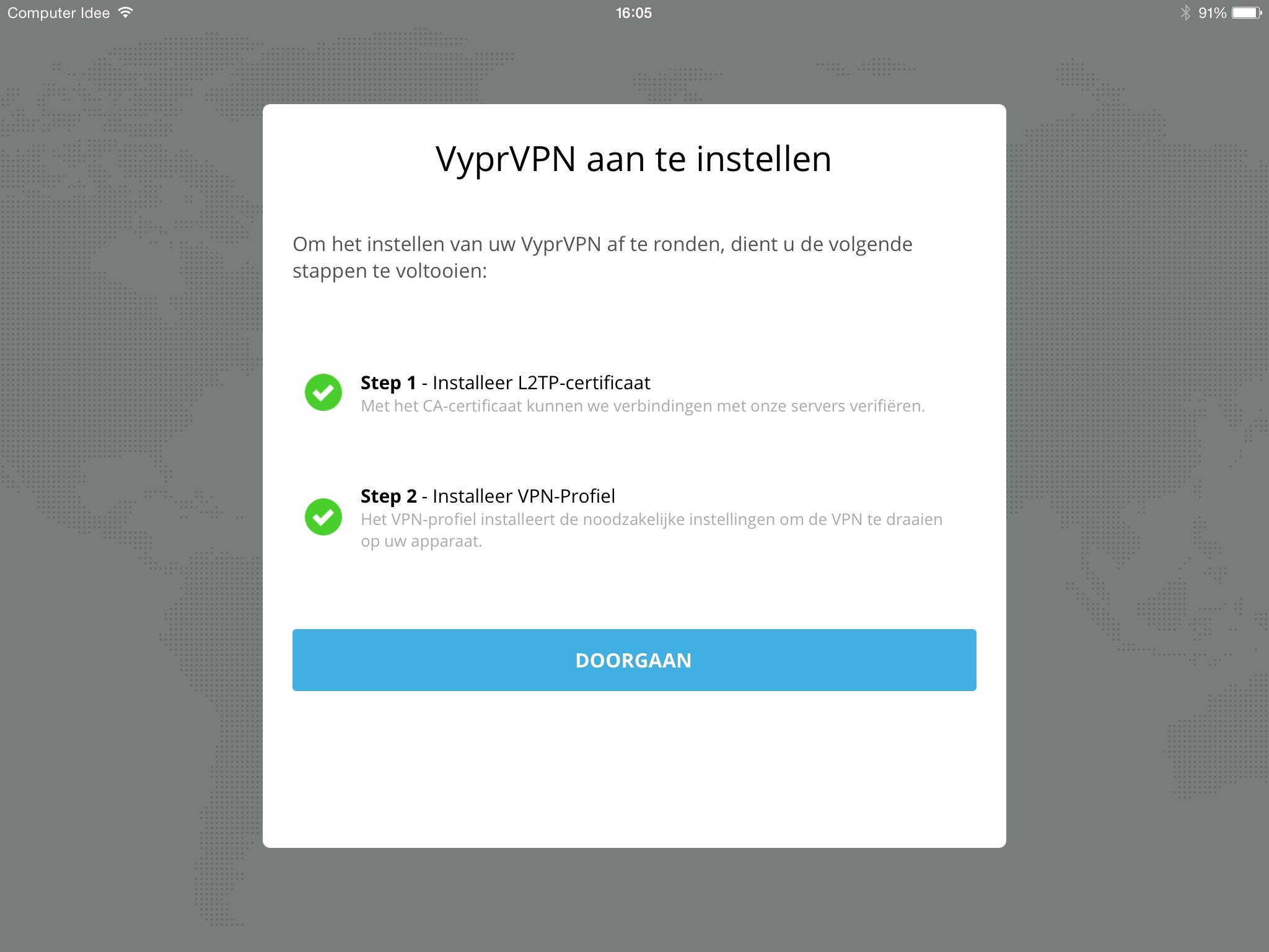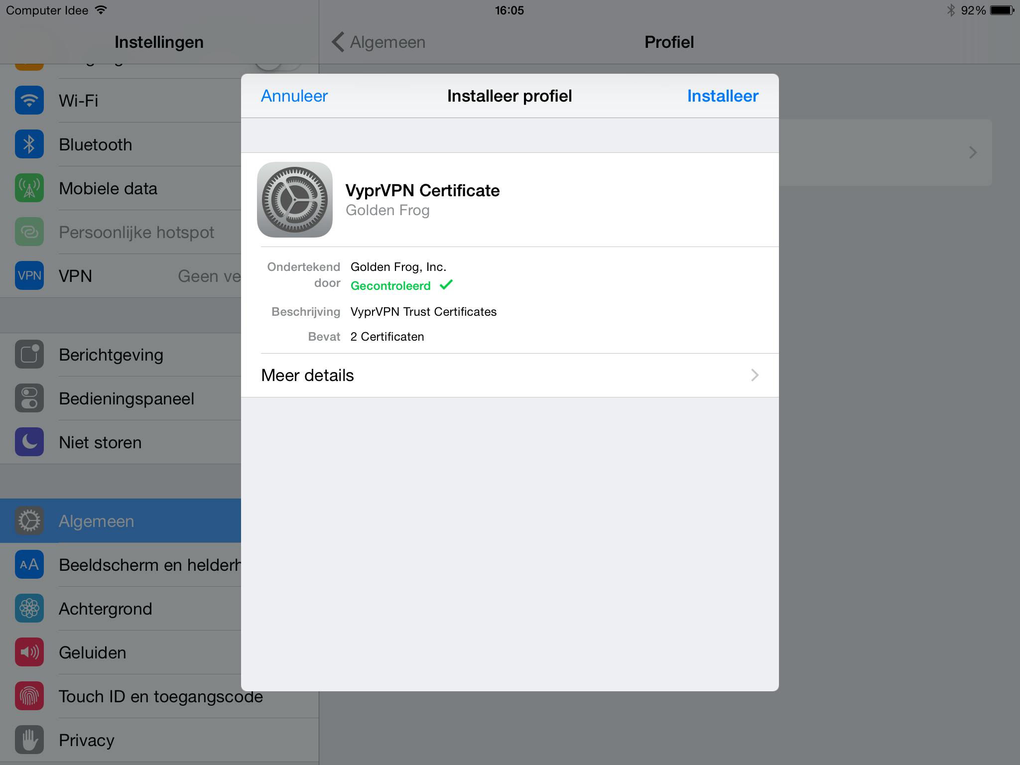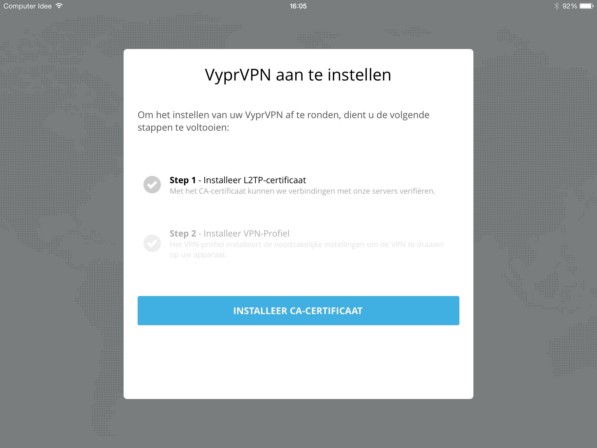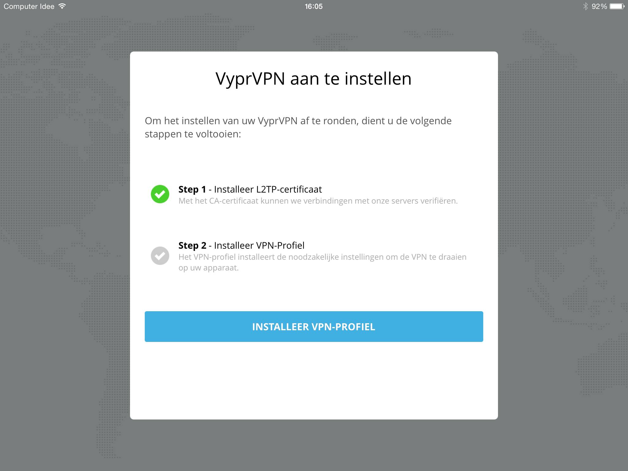 Je moet vervolgens je VPN-profiel installeren, dat is gekoppeld aan het account waarmee je bent ingelogd. Doe dat door te klikken op 'Installeer VPN-profiel'.