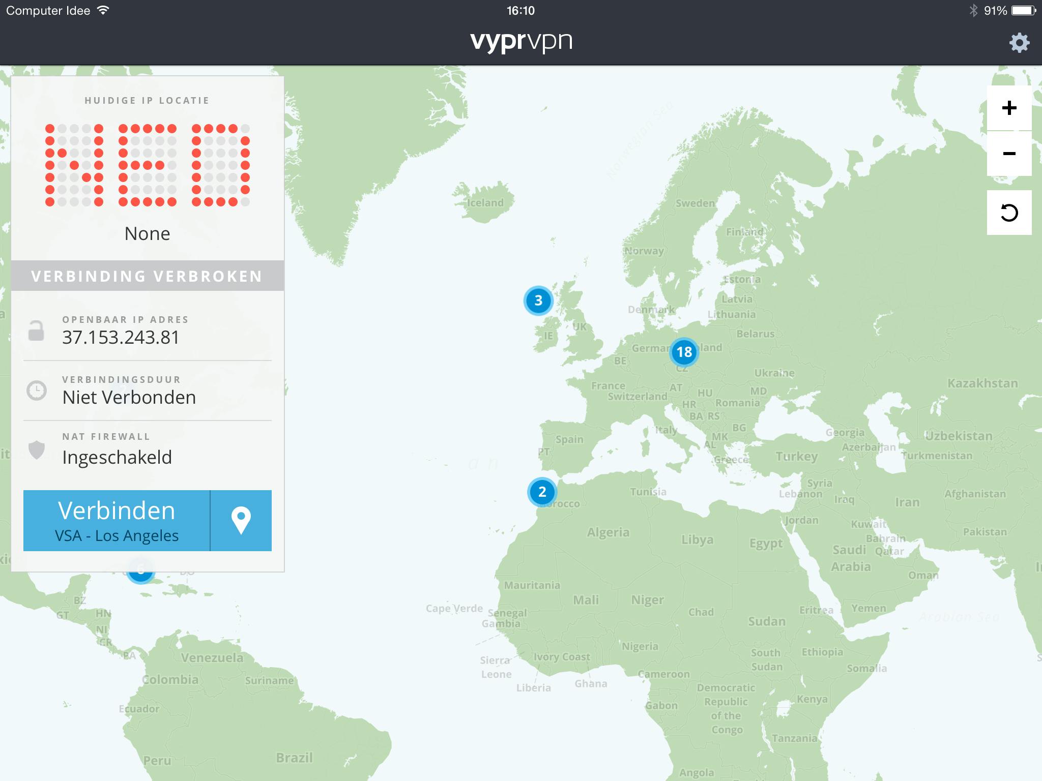 Je krijgt in de app een wereldkaart te zien, waar alle servers van VyprVPN op staan. Door links op het kaartje op het blauwe balkje te klikken. Je krijgt dan een lijst met servers te zien waaruit je kunt kiezen. Scroll naar 'Verenigde Staten' en selecteer daar een server.
