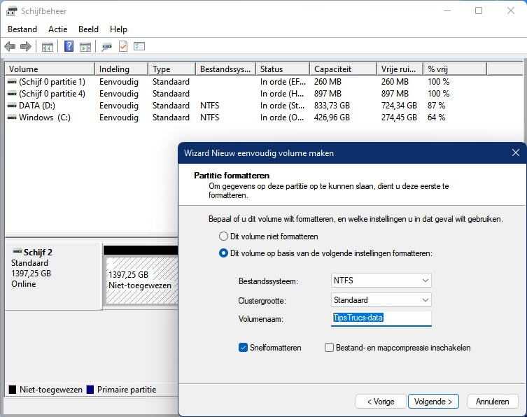 Bevestig met Volgende, wijs een vrije stationsletter toe en druk op Volgende. Je kunt via de optie Dit volume op basis van de volgende instellingen formatteren al meteen fase drie starten als je dit wenst. Bevestig met Volgende en met Voltooien. Als het goed is, is het station nu klaar voor gebruik en heeft ook de Verkenner het netjes herkend.