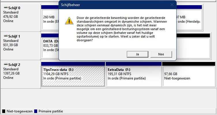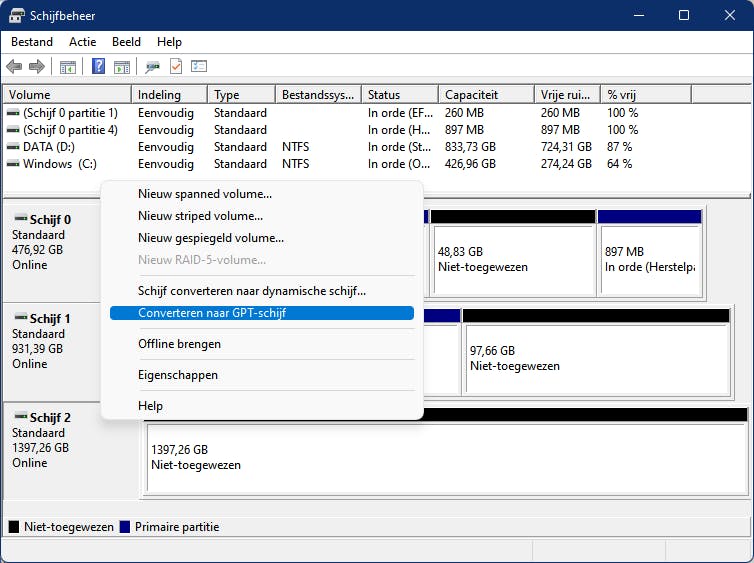 Heb je wel volumes maar hebben de daar opgeslagen data geen belang, dan kun je die desnoods eerst een voor een verwijderen. Klik met rechts op zo’n volume en kies Volume verwijderen / Ja. Zodra de schijf uitsluitend één Niet-toegewezen blok bevat kun je de partitiestijl alsnog aanpassen.