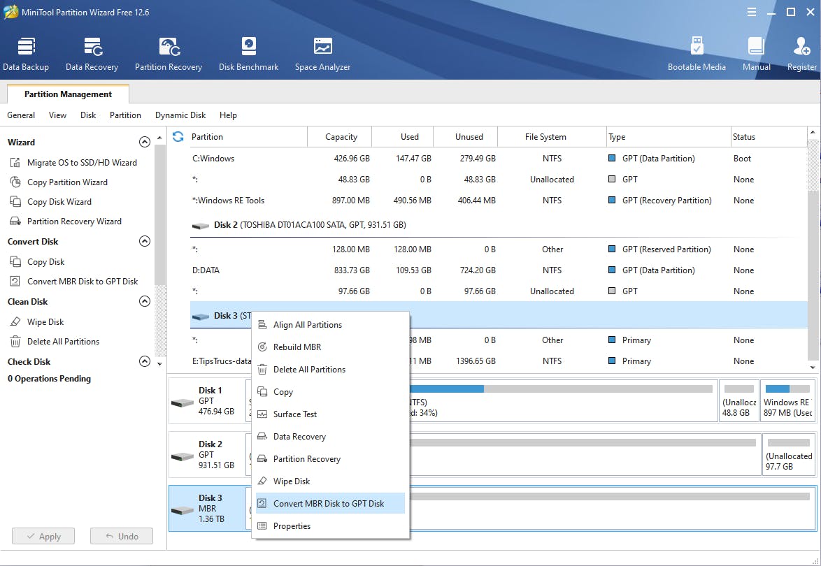Start de app op, klik met rechts op betreffende schijf en kies Convert MBR Disk to GPT Disk (of omgekeerd). De gevraagde actie wordt aan de takenlijst toegevoegd, linksonder bij Operations Pending, en deze zet zich door na je bevestiging met Apply / Yes.
