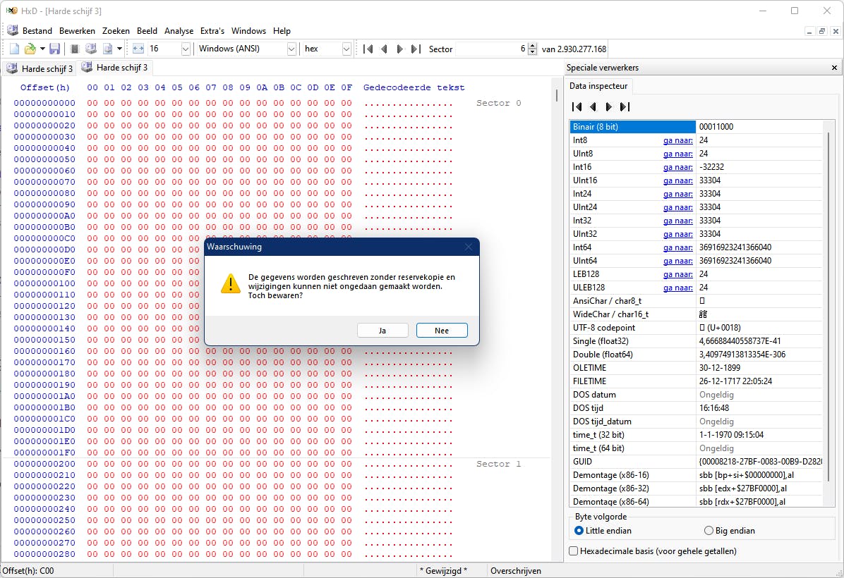 Download de tool HxD. Rechtsklik op de geïnstalleerde app en kies Als administrator uitvoeren. Ga naar het menu Extra’s en kies Open schijf. Bij Fysieke schijven selecteer je de juiste schijf; vergis je hier niet. Verwijder het vinkje bij Open als alleen-lezen. Klik op Sluiten en op OK. Selecteer met de muis de eerste twee fysieke sectoren, sector 0 en sector 1. Ga naar Bewerken, kies Vul selectie, laat Hex-waarden op 00 staan en druk op Sluiten. Open het menu Bestand, kies Opslaan en bevestig met Ja. Nogmaals, vergewis je er eerst van dat je de juiste schijf te pakken hebt!