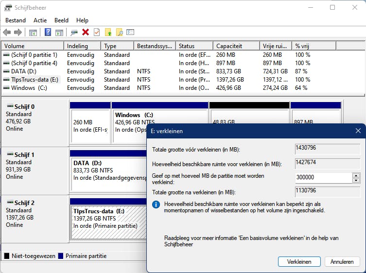 Er zijn natuurlijk nog andere operaties die je op partities uit kunt voeren. Je wilt bijvoorbeeld van één partitie twee partities maken. In Schijfbeheer kan dit door die eerst te verkleinen en van de vrijgekomen ruimte maak je vervolgens een nieuwe partitie.