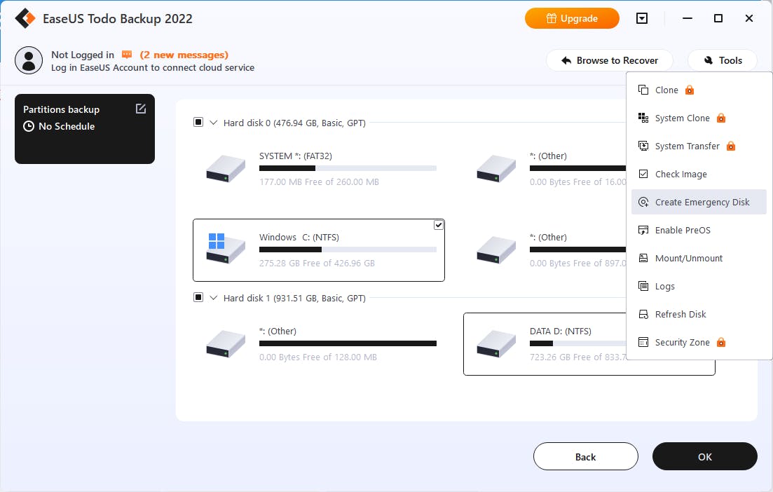 Iets wijzigen aan de partitionering van een schijf is altijd delicaat. De kleinste misstap kan je met een ontoegankelijke schijf of een onopstartbaar systeem opzadelen. Je maakt dus best vooraf back-ups. Daar bestaan verschillende gratis tools voor, waaronder het gebruiksvriendelijke Easeus Todo Backup Free 2022. Hiermee kun je zowel mappen, partities als complete schijven back-uppen.