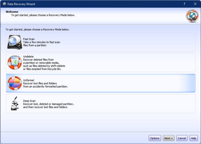 Je kunt het ook proberen met het gratis Lazesoft Recovery Suite Home. Klik op Data Recovery, kies Unformat en selecteer het betreffende station. Druk op Next, kies (initieel) Automatic drive recovery en bevestig met Start Search. Open Lost File Results en duid de extensies aan van de bestanden die je wilt herstellen. Met wat geluk duiken die vervolgens in het rechterpaneel op. Lukt het niet met de optie Unformat, dan kun je het nog proberen met Deep Scan.