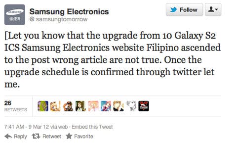 Hoewel volgens berichten Android 4 morgen beschikbaar zou komen voor de Samsung Galaxy S2 , spreekt Samsung dat nu tegen.