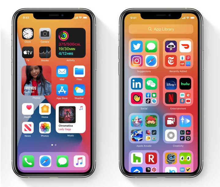 iOS 14 bevat ook de mogelijkheid om apps en games te verbergen op je thuisschermen. Een veelgevraagde functie, want niet iedereen zit te wachten op schermen vol app-icoontjes of mapjes. Apple noemt de functie App Library en stelt dat iOS automatisch apps en games sorteert in groepen. Zo maakt de software bijvoorbeeld een map vol Apple Arcade-games. Vergelijk de functie met de applade die al jaren in Android beschikbaar is, maar dan - zo lijkt het - slimmer.
