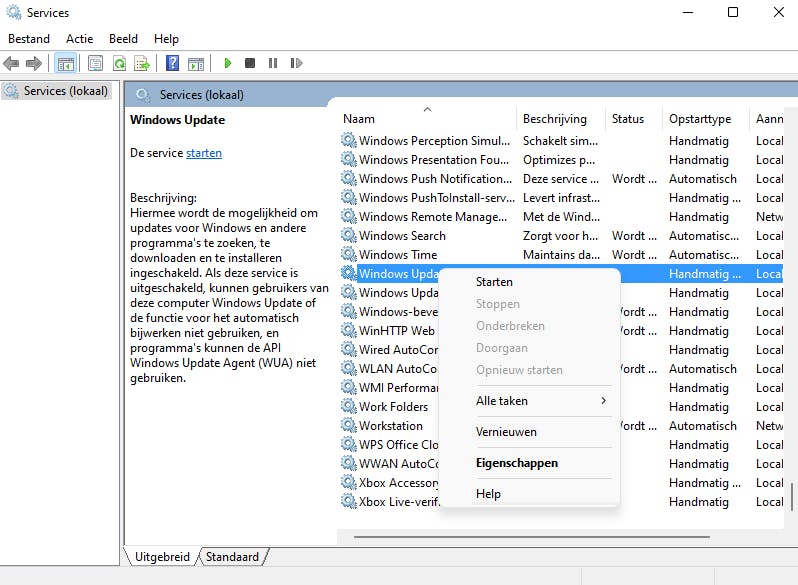 Er is nog wel een andere manier om te voorkomen dat updates automatisch worden geïnstalleerd. Druk op je toetsenbord tegelijk de Windows-knop en R-toets in, om in het Uitvoeren-venster te komen. Type hier services.msc en druk op OK of op Enter. In het Services-menu dat verschijnt, scrol je in de lijst met diensten helemaal naar onder totdat je Windows Update ziet staan. Klik hierop met de rechtermuisknop en kies voor Eigenschappen. Als je bij Status van service de tekst Wordt uitgevoerd ziet, dan klik je op Stoppen. Staat er bij de status al Gestopt, dan doe je niks.