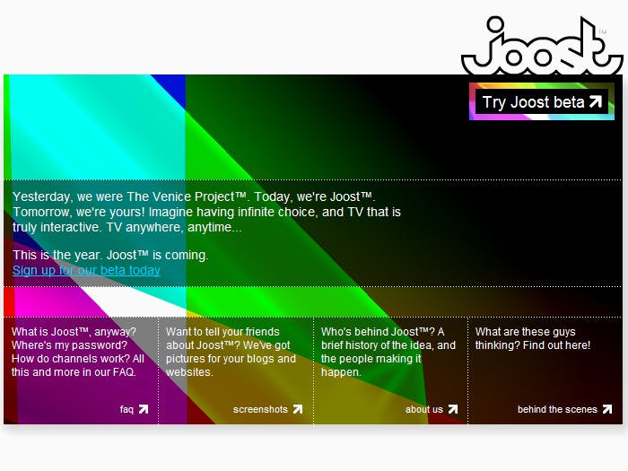Joost was voorheen bekend onder de codenaam ‘The Venice Project'. Joost biedt studio's en andere aanbieders van hoge-kwaliteit video een goedkope en veilige manier van distributie. Net als met hun eerdere projecten Skype en Kazaa, zullen Friis en Zennstrom voor de videodienst gebruikmaken van peer-to-peertechnologie.
