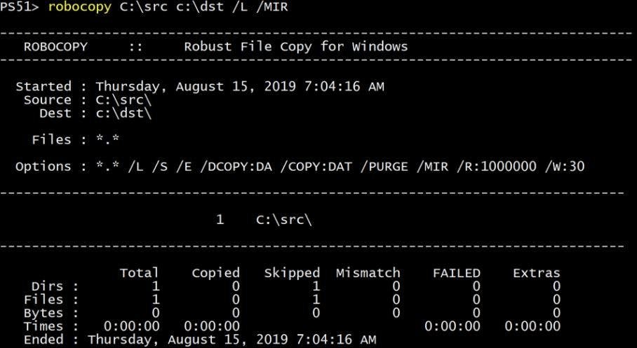 Om een paar sterktepunten van robocopy te noemen: het heeft een degelijke ondersteuning van multithreading, gestandaardiseerde exit-codes voor scripting, kopieeroperaties met automatische herneming over een netwerk, ingebouwde taakplanning enzovoort. We houden het hier bij één eenvoudig voorbeeld: