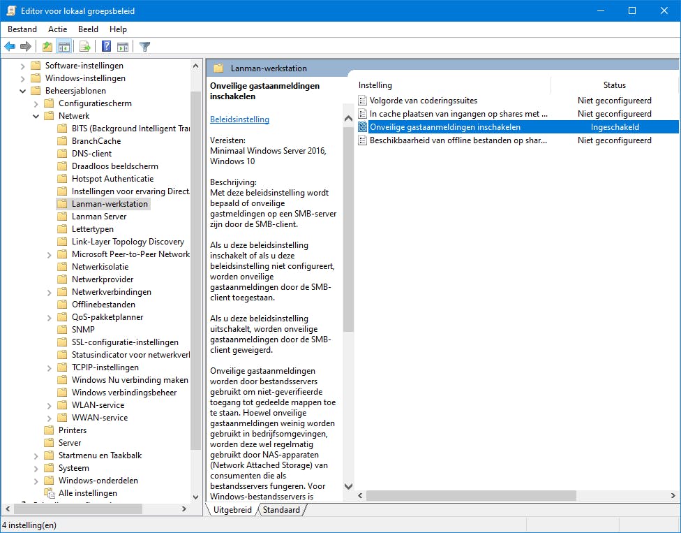 Let op: krijg je vanuit een systeem met Windows Pro geen toegang tot zo’n share, druk op die pc dan op Windows-toets+R, voer gpedit.msc uit, navigeer naar Computerconfiguratie / Beheersjablonen / Netwerk / Lanman-werkstation, dubbelklik in het rechterpaneel op Onveilige gastaanmeldingen inschakelen en stel dat in op Ingeschakeld.