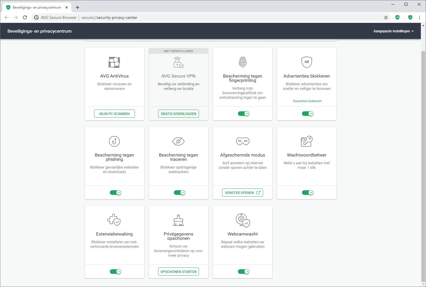 Via duidelijke pictogrammen heb je rechtstreeks toegang tot de onderdelen Snelle scan, Systeemscan, Kwetsbaarheidsscan, VPN en Safepay. Voeg naar eigen inzicht extra functies aan het hoofdvenster toe, zoals een bestandsvernietiger of opruimtool.
