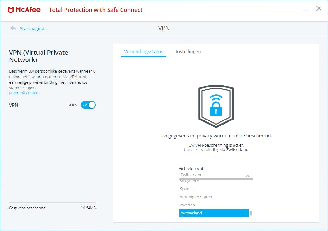 McAfee Total Protection is één van de weinige antivirusprogramma’s die een aantal zinvolle vernieuwingen heeft ondergaan. Zo is de geïntegreerde vpn-functie (afzonderlijk verkrijgbaar tegen een meerprijs) nu direct vanuit het hoofdvenster beschikbaar. Je kunt voor de snelste vpn-verbinding kiezen, maar je kunt ook een ip-adres uit een specifiek land aannemen.