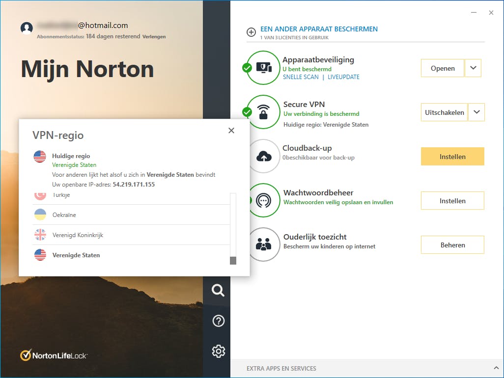 Zoals we inmiddels van Norton gewend zijn, biedt de antivirussoftware veel waar voor zijn geld. Overigens zijn er amper vernieuwingen, maar dat is met zo’n breed scala aan functies ook helemaal niet nodig. Zo is er geen enkele aanbieder die tegen zo’n lage prijs een vpn-functie zonder beperkingen beschikbaar stelt. Met één muisklik in het hoofdvenster realiseer je een beveiligde verbinding.