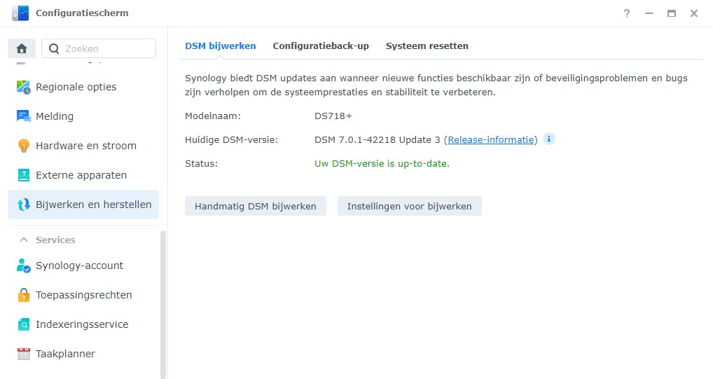 Zowat elke Synology-NAS is geschikt om videobeelden vast te leggen. Zet het apparaat aan en ga met een willekeurige browser naar http://find.synology.com. Via Verbinding maken log je in met een gebruikersnaam en wachtwoord. Belangrijk is dat de nieuwste versie van het besturingssysteem Disk Station Manager (DSM) is geïnstalleerd. Navigeer hiervoor naar Configuratiescherm / Bijwerken en herstellen en controleer of er een verse update klaarstaat. Werk het besturingssysteem zo nodig bij.