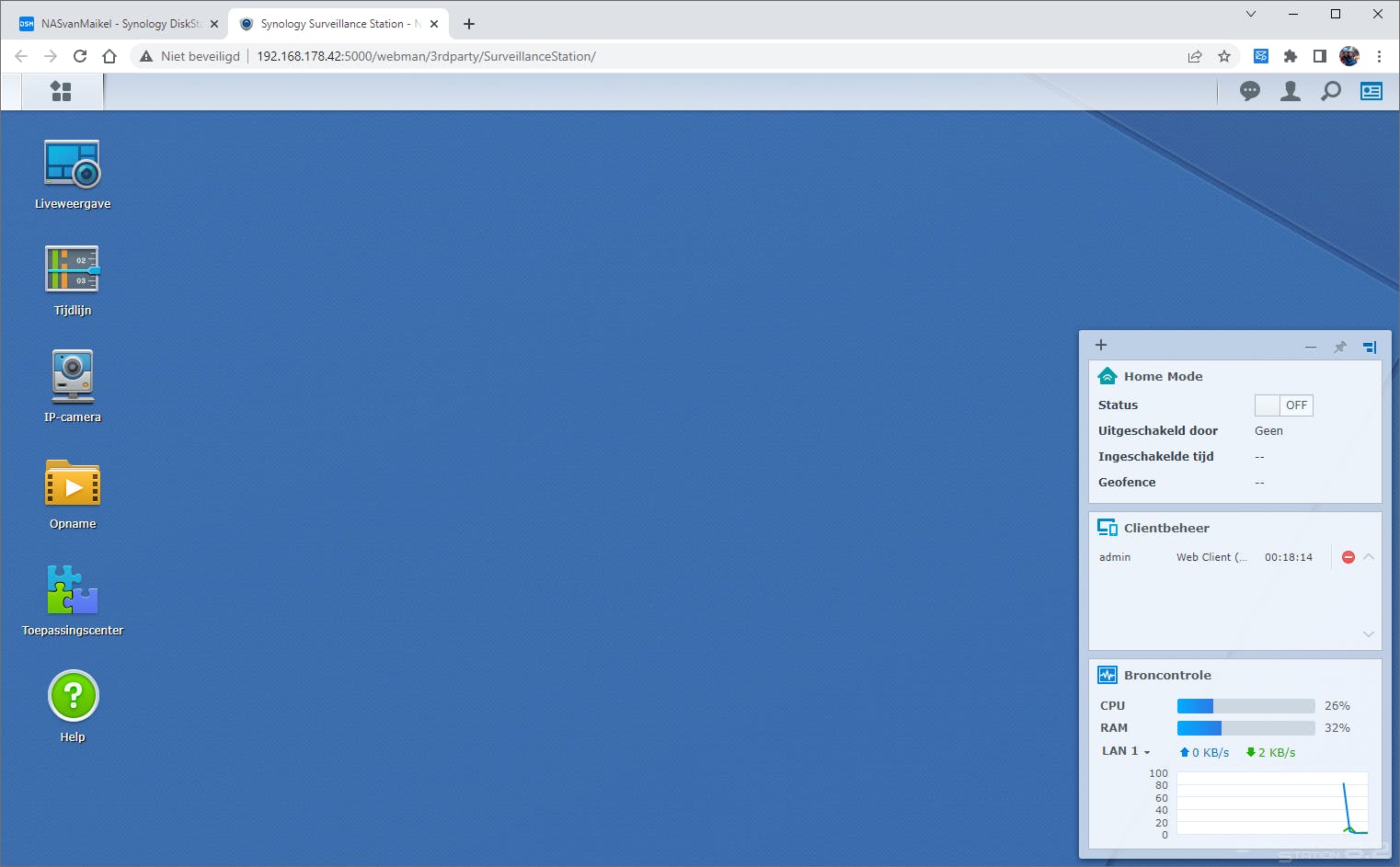Surveillance Station is een webgebaseerde app. Gunstig, want hierdoor kun je met elk apparaat (live)beelden oproepen. Na afloop van de installatie nestelt de app zich in het hoofdmenu. Klik erop met de rechtermuisknop en kies Toevoegen aan bureaublad. Zo heb je voortaan sneller toegang. Zodra je klikt op Surveillance Station, opent de app in een nieuw tabblad van de browser.