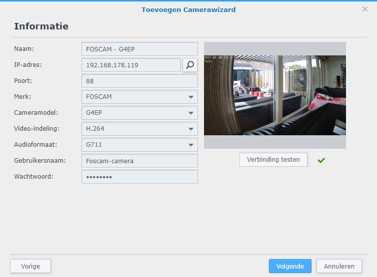 Vaak werkt het ook wanneer je een vergelijkbare camera van hetzelfde merk selecteert. Vul in ieder geval het ip-adres, het poortnummer en de inloggegevens in. Klik op Verbinding testen. Zodra er beeld verschijnt, bevestig je met Volgende / Voltooien. Je voegt eventueel nog meer camera’s toe.