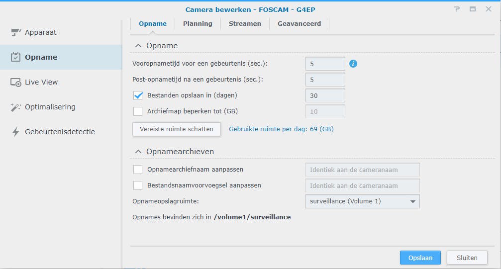 Heb je geen idee hoeveel opslagruimte de camera opeist? Klik dan eerst op de knop Vereiste ruimte schatten / Ja. Controleer achter Opnameopslagruimte of het juiste NAS-volume is geselecteerd.
