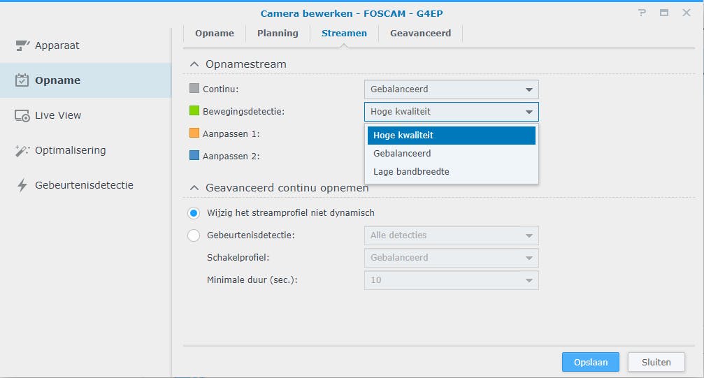 Overigens schakelt Surveillance Station bij bewegingsdetectie op jouw verzoek gemakkelijk over naar een betere opnamekwaliteit. Kies dan in het uitrolmenu achter Bewegingsdetectie de optie Hoge kwaliteit. Klik ten slotte op Opslaan.