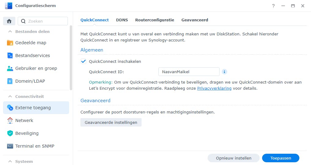 Navigeer binnen DSM naar Configuratiescherm / Externe toegang en zet een vinkje voor QuickConnect inschakelen. Bevestig met Toepassen. Overigens heb je voor deze functie wel een Synology-account nodig. Vermoedelijk heb je dat tijdens het instellen van de NAS al aangemaakt.