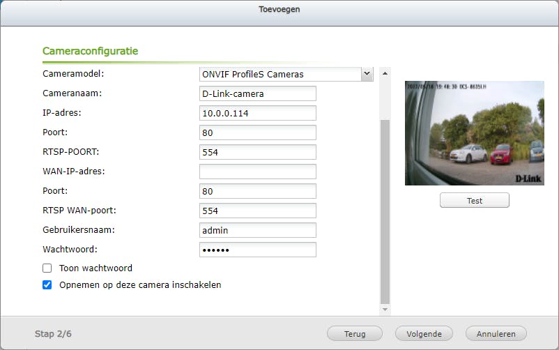 Je kunt als alternatief ook een soortgelijk exemplaar van dezelfde fabrikant selecteren. Vul zo nodig de cameranaam, het ip-adres en het poortnummer in. Verder zet je een vinkje voor Opnemen op deze camera inschakelen. Klik onder het videokader op Test. Verschijnt er een voorbeeldweergave? Dan staan de instellingen goed. Klik op Volgende.