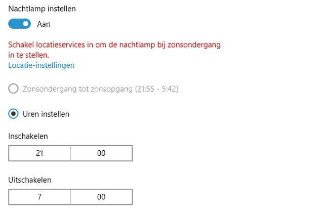 Je stelt de zonsopgang- en zonsondergangstijden in en je kiest een dag en nachtinstelling. Hier kun je de schermweergave nauwkeuriger regelen dan in de standaard Windows-settings.