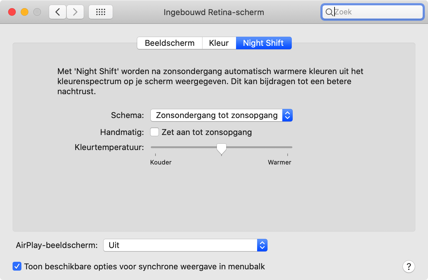 Heb je een Mac? Dan heb je in principe ook geen blauwlichtfilter van derden nodig. In de Syteemvoorkeuren die je via het Apple-pictogram linksboven bereikt, zit in het onderdeel Beeldschermen het tabblad Night Shift. Daar staat de optie om de filter van zonsondergang tot zonsopgang op je locatie toe te passen en een aangepast schema samen te stellen.