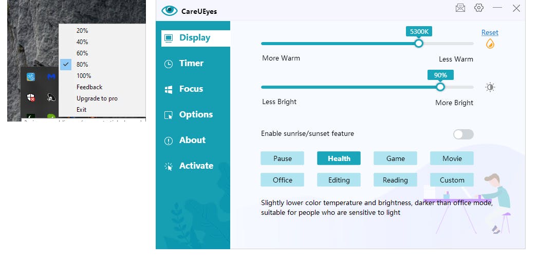 De freeware CareUEyes voor Windows regelt vanuit het systeemvak de helderheid in stappen van 20, 40, 60 en 80 procent. Er is dus geen manier om de temperatuur aan te passen of om rekening te houden met het tijdstip van de dag. In feite kun dit je net zo goed via de gewone systeeminstellingen regelen.