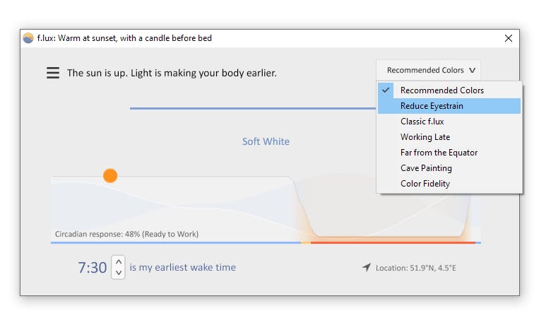 F.lux voor Windows, macOS, Linux en zelfs Android en iOS, werkt op de achtergrond en past de kleurtemperatuur van het scherm aan het tijdstip van de dag aan. Het gratis programma vraagt eerst of het jouw locatie mag bepalen. Als je computer of mobiele toestel locatievoorziening ondersteunt, komt je werkplek vanzelf op het kaartje. Anders kun je de locatie gewoon in het zoekvak invoeren.