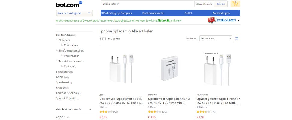 "Als er bijvoorbeeld staat originele accessoire voor de Apple iPhone, vinden wij dat misleidend als die niet echt van Apple is," aldus Bol.com-directeur Daniel Ropers vandaag tegenover AD.nl. 'Accessoire geschikt om een merktelefoon mee op te laden' zou in zo'n geval een beter alternatief zijn.