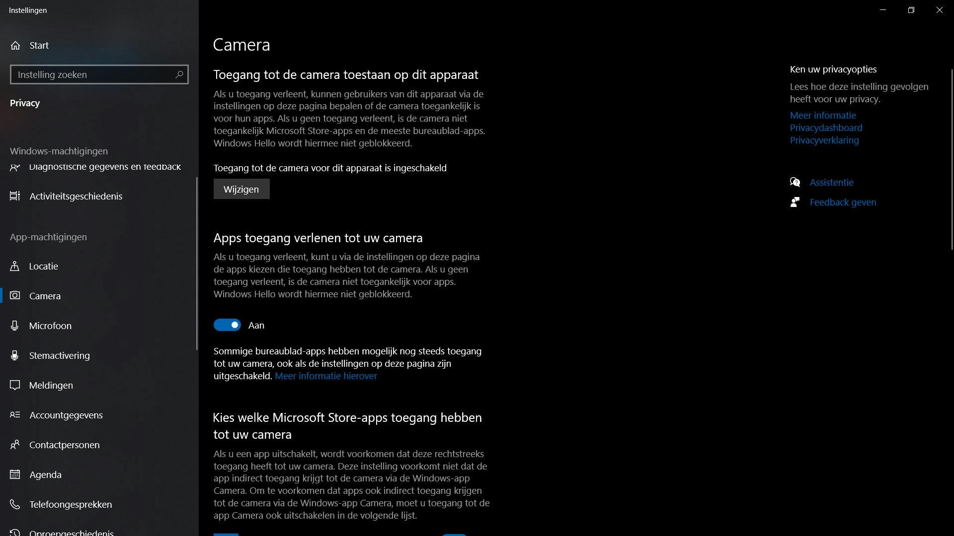 Mocht je camera gewoon herkend worden, dan kunnen je privacyinstellingen roet in het eten gooien. Open het Startmenu en typ Privacyinstellingen in. Bovenaan verschijnen dan de instellingen voor de camera, klik daarop. Onder het kopje Apps toegang verlenen tot uw camera moet je ervoor zorgen dat de schuifregelaar naar rechts staat, blauw is en op Aan staat. Dan weet je zeker dat apps met de juiste toestemmingen de camera kunnen gebruiken.