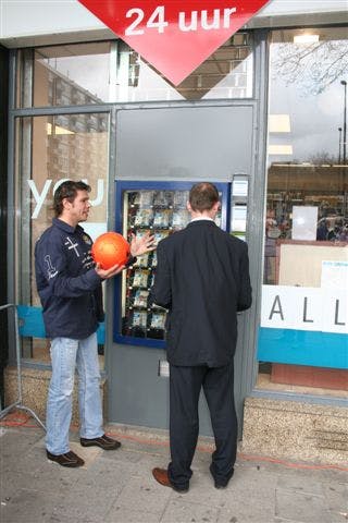 Snoep, blikjes drinken, sigaretten en kroketten - daarvan weten we dat je ze ook 'uit de muur' kunt halen. Nieuw is dat met cartridges voor de printer. Kan vanaf vorige week ook, in Rotterdam om precies te zijn.Aan de Goudsesingel in Rotterdam werd afgelopen vrijdag de eerste HP cartridge automaat van Nederland in gebruik gemaakt. Hoewel de naam anders doet vermoeden, kunnen voorbijgangers ook cartridges van Canon en Epson 'trekken', 24 uur per dag, 7 dagen per week. Makkelijk wanneer in het weekend of 's avonds de printer roept om inkt dus. Betaling gebeurt via pin of chipknip. En wat die man met die voetbal op de foto doet? Dat is keeper Patrick Lodewijks, die de 'aftrap' gaf. Zijn club? Wat dacht u, bij een Rotterdamse cartridge-automaat? Feyenoord!