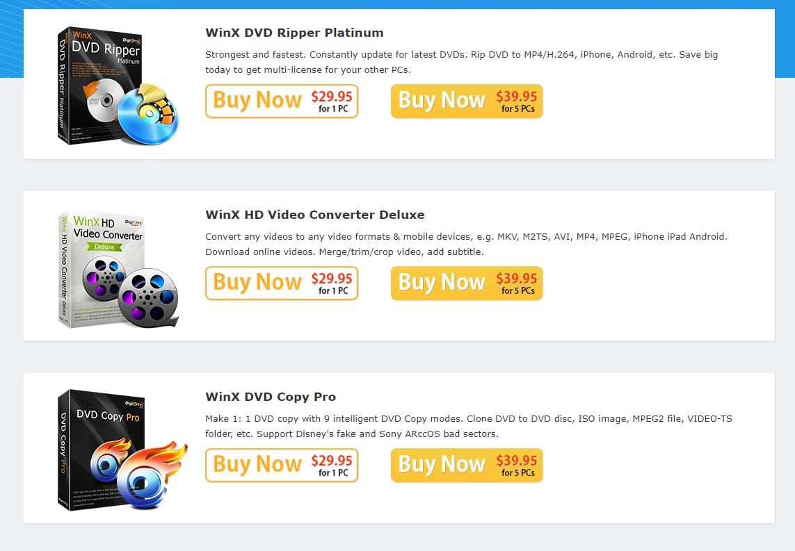 Waar het rippen van een cd altijd al vrij makkelijk is geweest, lag dat voor dvd lange tijd anders. Nog steeds is het zo dat als je zoekt op software voor het rippen van een dvd, je heel veel rommel tegenkomt. Het programma dat we je aanraden is WinX DVD Ripper. We zeggen er direct bij: dit programma is niet gratis. We hebben door de jaren heen diverse gratis programma’s gebruikt en lopen altijd tegen dezelfde problemen aan: ze zijn buggy, extreem traag, crashen om de haverklap en/of zetten een logo over je video, tenzij je de betaalde versie kiest. WinX DVD Ripper kost 60 dollar en dat is enorm aan de prijs als je maar één dvd wilt omzetten (in dat geval is een traag programma geen probleem). Wij gaan echter voor je hele dvd-collectie en dan is goede software gewoon belangrijk. WinX DVD Ripper omzeilt ook probleemloos de meeste drm-drempels (wat dus eigenlijk niet mag) en dat scheelt je een hoop gedoe. Let op, schaf het product aan via deze url en niet via de homepage, anders betaal je 60 dollar in plaats van 30.