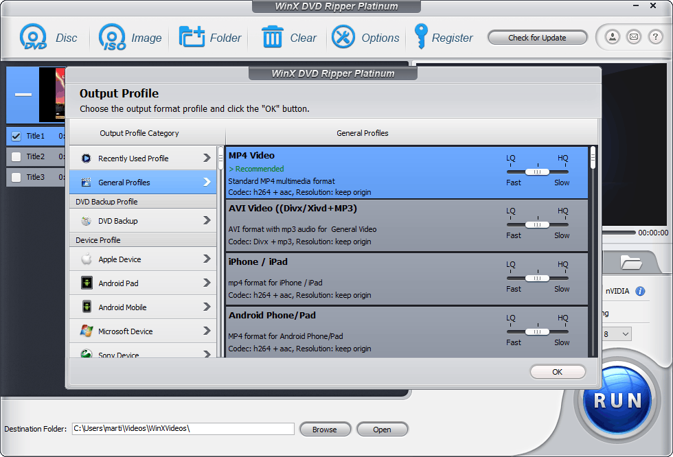 Nu is het tijd om de dvd die je wilt rippen in de dvd-speler te plaatsen. In tegenstelling tot iTunes zal WinX DVD Ripper zelf geen actie ondernemen. Wanneer je de dvd hebt geplaatst, klik je linksboven op de knop Disc. Vervolgens geef je aan hoe je het bestand wilt vormgeven. Wil je de films graag rippen om op je smartphone te kijken, dan kun je dat aangeven. Het bestand zal dan kleiner zijn (maar de kwaliteit ook iets minder). Wij gaan voor MP4 Video, omdat we daarna zelf kunnen besluiten op welk apparaat we de video bekijken en de maximale kwaliteit bewaard wordt. Vervolgens kun je bij het profiel dat je kiest ook nog aangeven hoe hoog je de kwaliteit precies wilt hebben met behulp van een schuifregelaar. Hoe hoger de kwaliteit, hoe langer de software ervoor nodig zal hebben. Heb je je keuze gemaakt, klik dan op OK.