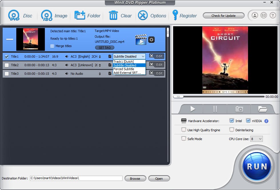 Wat belangrijk is om te weten, is dat een dvd veel meer bevat dan alleen de film die je bekijkt. De voorstukjes, de bloopers en al het andere bonusmateriaal zijn allemaal afzonderlijke tracks op een dvd, zoals liedjes tracks op een cd zijn. Het is uiteraard belangrijk dat je de track kiest van de film en niet van het bonusmateriaal enzovoort. Die track herken je gelukkig vrij eenvoudig, het is namelijk de langste track op de dvd. Plaats daar een vinkje voor. Vervolgens zie je in die track twee uitklapmenu’s. Het linkermenu is voor de audio, het rechtermenu is voor de ondertitel. Kies in beide menu’s de taal die je wilt of kies voor Subtitle disabled als je geen ondertitels wilt. Als je nu bovenin klikt op Set tag, dan kun je de dvd een naam geven en wat extra informatie invullen, zodat het programma waarin je de video gaat bekijken wat meer gegevens kan tonen. Wanneer je alles hebt ingesteld, klik je op Run om het bestand daadwerkelijk te rippen. En nu zul je precies zien waarom we zo enthousiast zijn over WinX DVD Ripper, want waar andere software een half uur tot soms wel een uur doet over het rippen van een dvd, klaart dit programma de klus binnen tien minuten (tenzij je Lord of the Rings ript).